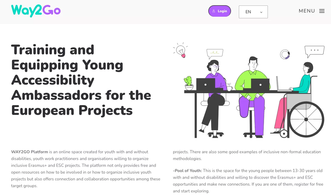 The project also aims to ensure the participation of a wider community and to raise awareness of the importance of inclusivity and accessibility in youth work through awareness campaigns. Way2Go will deliver three main outputs over 24 months: an online platform and app, a pool of skilled and trained Youth Accessibility Ambassadors, and a functional network connecting project seekers with diverse skills to inclusive organizations. This network will support and encourage Erasmus+ and ESC projects that prioritize inclusivity and strive for accessibility, making inclusivity and accessibility integral parts of the European project landscape.